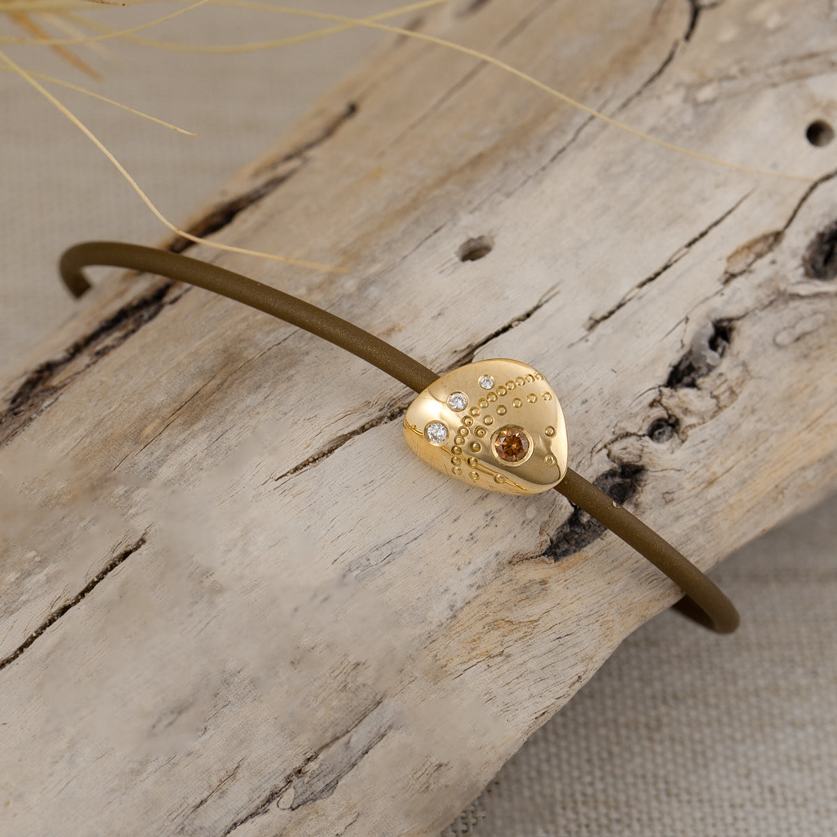 Purnululu Neo Slider Bracelet - An adjustable bracelet featuring an 18ct gold Bungle Bungle inspired landscape design with flush set champagne and white diamonds and dot-painting texture on bronze neoprene slider bracelet. . Diamonds: 1 = 0.075ct Round Brilliant Cut Champagne Diamonds Si clarity 3 = 0.04ct Round Brilliant Cut White Diamonds D-F colour Si clarity